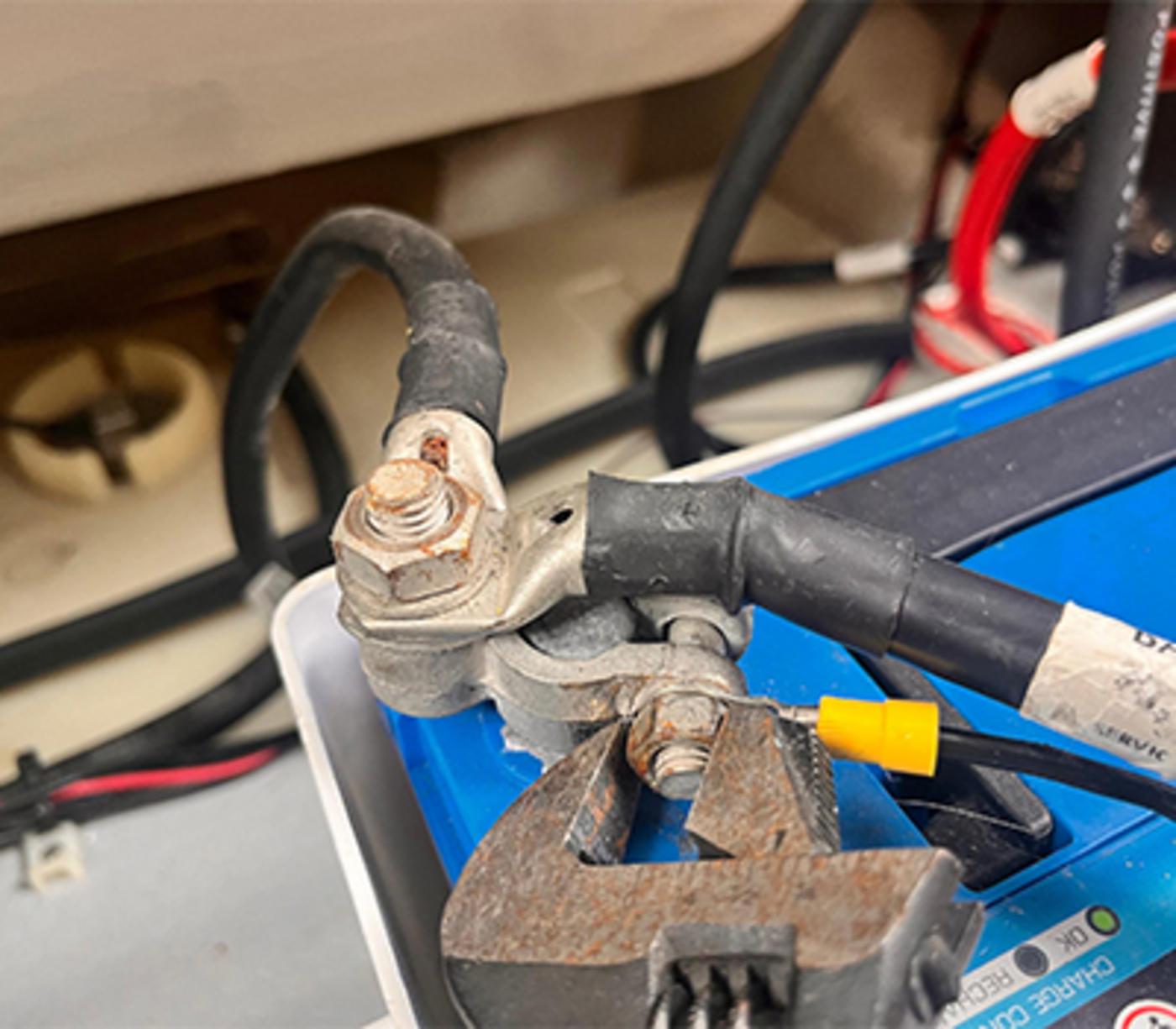 Kabeln mellan batteri och regulator med ringkabelskor på kopplades in med motsatt