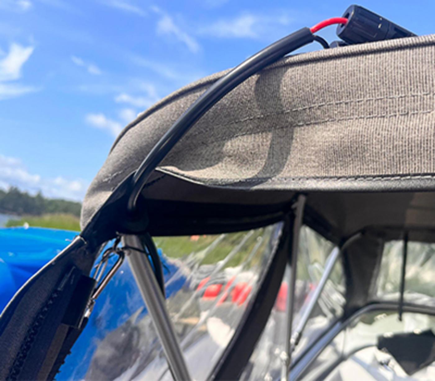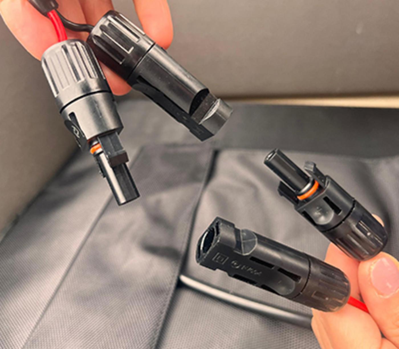 Solpanelen kommer med två kablar, den ena är fastmonterad i själva solpanelen och den andra är förberedd med en säkring som ligger löst för att kunna montera antingen en regulator eller, som i vårt fall, MC4-kontakter så att vi enkelt kan koppla loss solpanelen när vi inte vill använda den. Processen för att koppla dessa MC4-kontakter görs på följande vis som visas i filmen nedan.