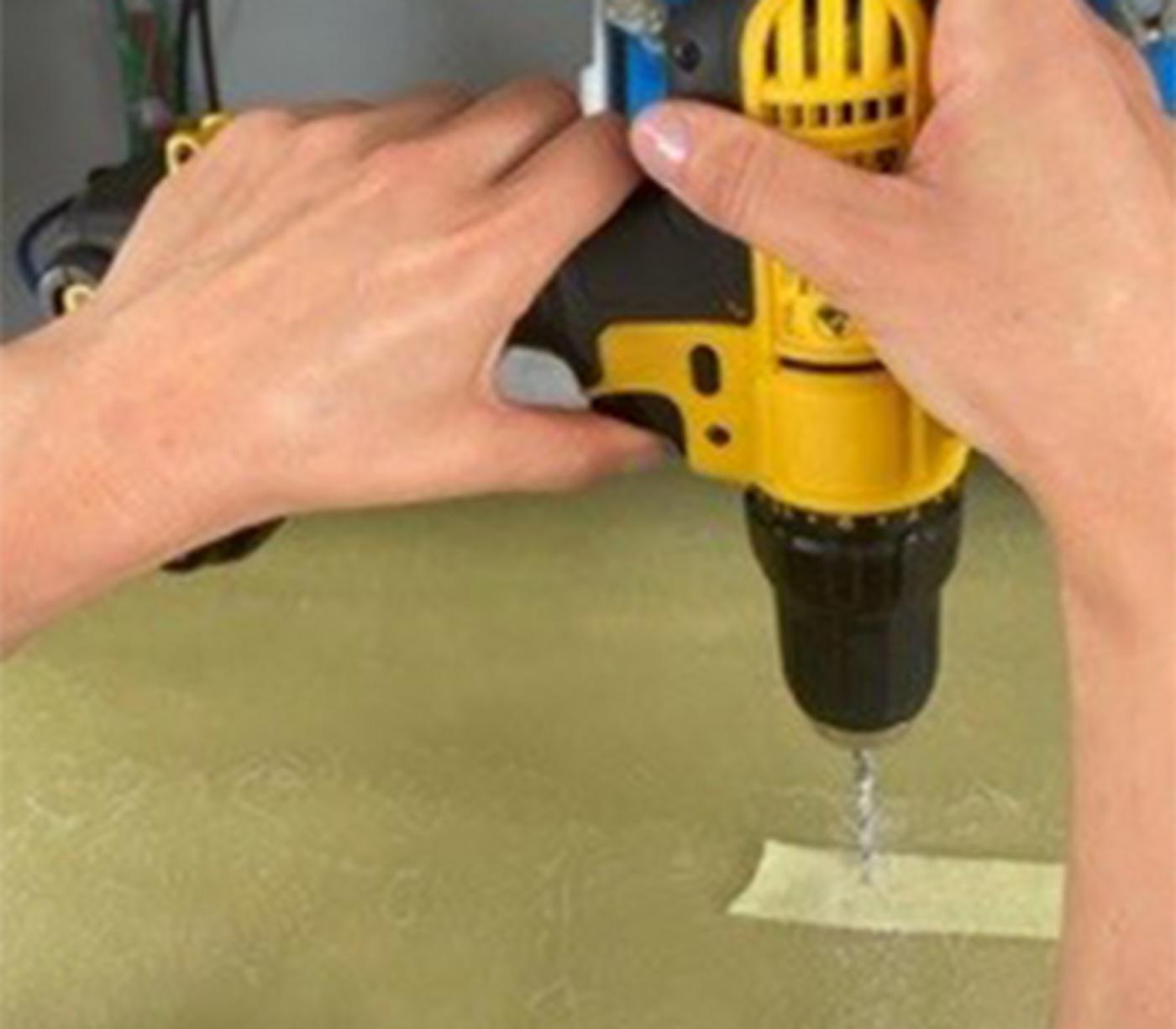 För att säkra regulatorn på plats, borrade vi fyra hål och fäste den med hjälp av bultar, muttrar och brickor.