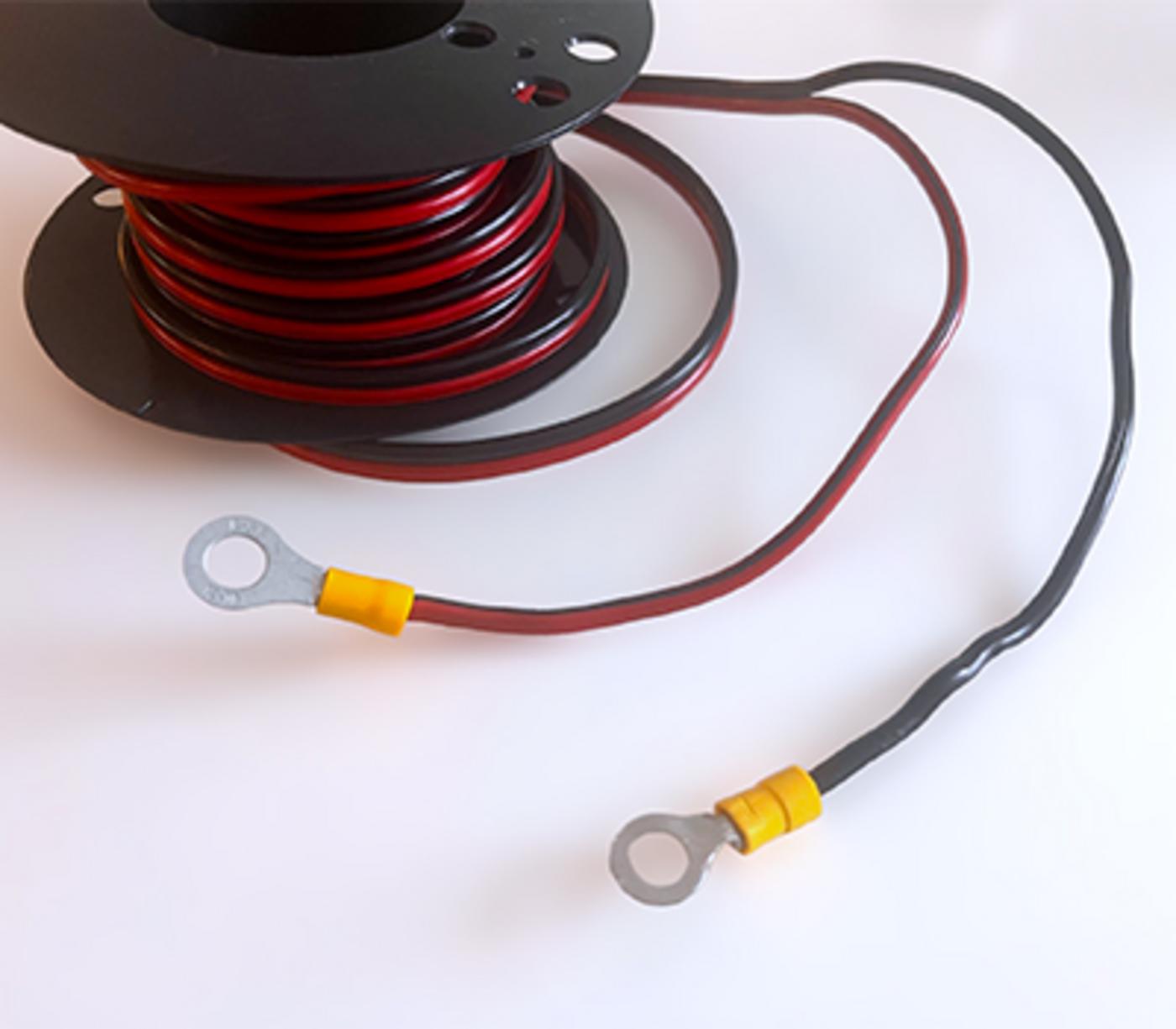 För att få till en tillförlitlig koppling från regulatorn till batteriet så använde jag mig av en minirulle med förtent kabel som jag sedan klämde fast ringkabelskor på (som det så fint heter 😉) med hjälp av en crimptång. Efter att vi hade bestämt var regulatorn skulle sitta så måttade vi ut avståndet utefter hur kabeldragningen skulle gå och klippte kabeln.