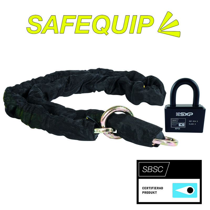 Detta kompletta låspaket från Safequip erbjuder högsta säkerhetsnivå för att skydda din båt, motor eller annan värdefull utrustning. Paketet innehåller en klass 3-certifierad låskätting och ett klass 3 hänglås, båda godkända av SBSC (Svensk Brand & Säkerhetscertifiering AB) enligt strikta säkerhetskrav. Den 2,5 meter långa kättingen är försedd med ett skyddshölje i tyg samt kromaterad och ytbehandlad för att ge extra korrosionsskydd för användning i marina miljöer.