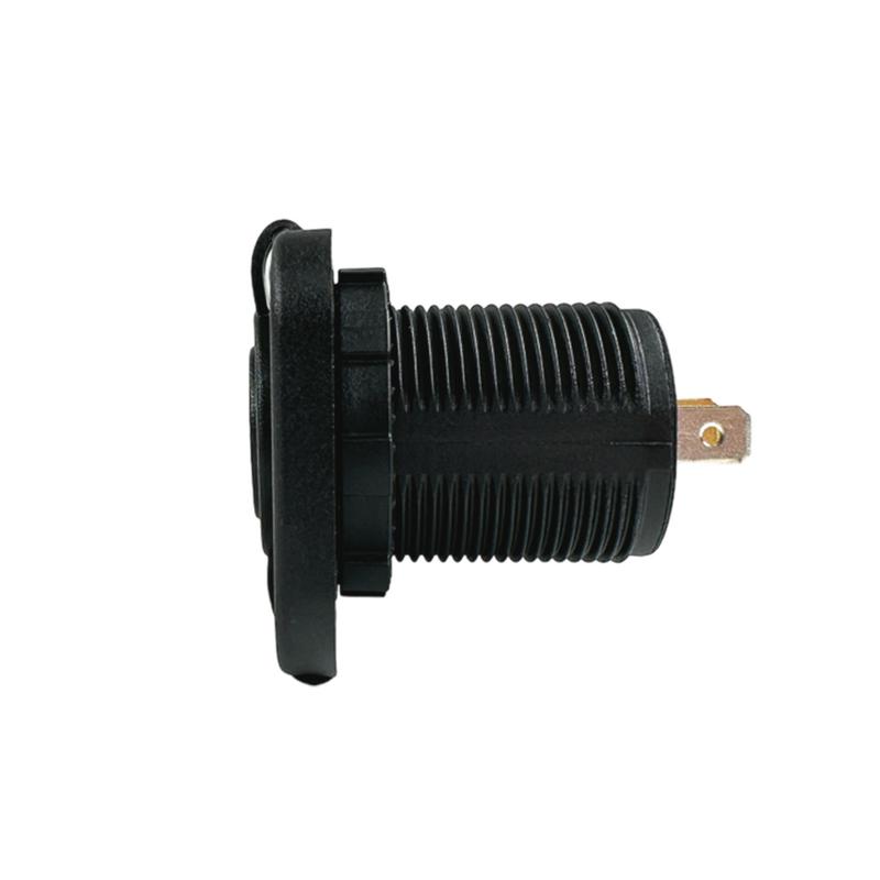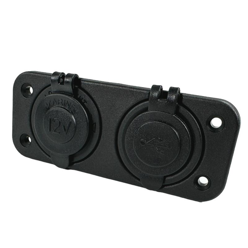 Kombinerat 12V-uttag och USB-uttag från Pro Supply. Denna enhet gör att du både kan ansluta en ciggkabel till 12V-uttaget och två stycken USB-kablar för strömförsörjning. Uttagen är utrustade med skyddslock som håller väta och damm borta.