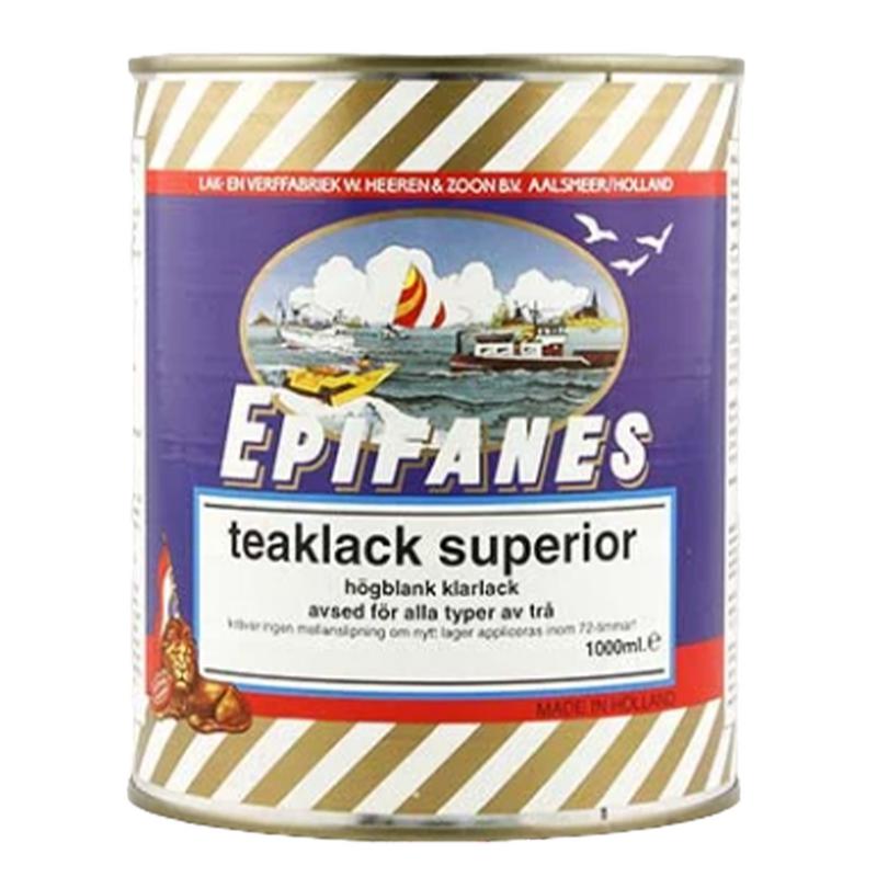 Epifanes Teaklack Superior är en traditionell högglanslack med UV-skydd, speciellt framtagen för feta träslag som t.ex teak och iroco. Används ovan vattenlinjen in- och utvändigt. Viktigt! Feta träslag ska vara väl rengjorda med Epifanes sprutförtunning och inte oljas före lackning.