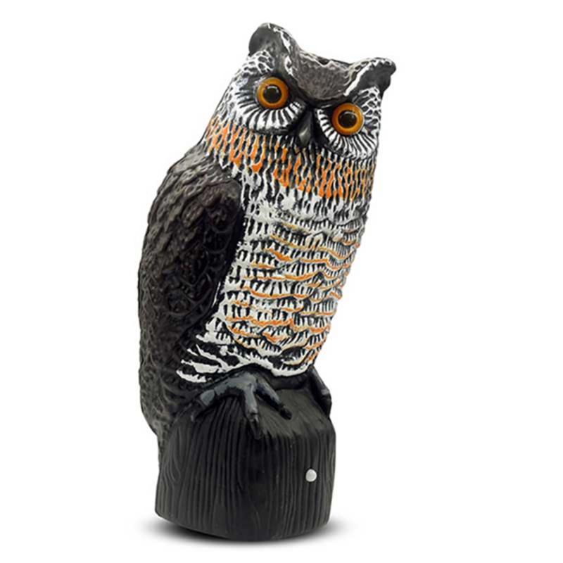 Naturtrogen uggla som skrämmer bort måsar och andra oönskade fåglar eller gnagare. Solcellsdriven med inbyggt batteri och rörelsesensor. När något passerar blinkar ögonen och ugglan ger ifrån sig ett litet "hoho".