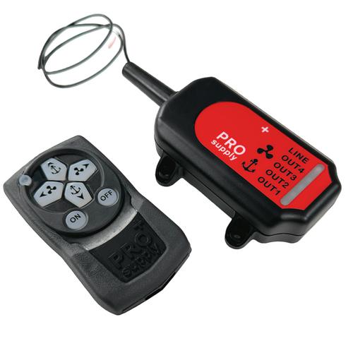 Fjärrkontroll och mottagare från ProSupply. Den trådlösa fjärrkontrollen med fyra kanaler är perfekt anpassad för smidig och effektiv styrning av ankarspel och bogpropeller. Denna innovativa lösning ger användare friheten att styra sina marina system trådlöst, vilket ger enkelhet och bekvämlighet ombord.