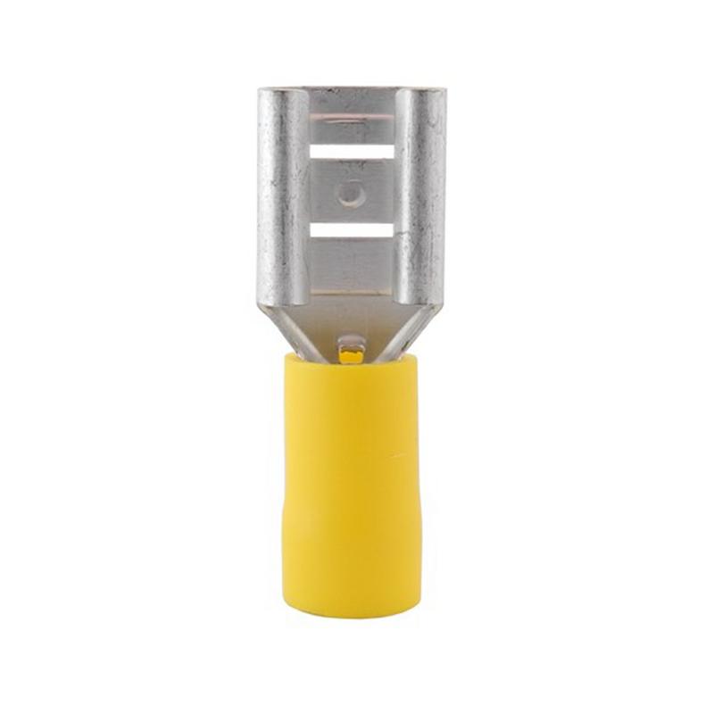 Gul helt isolerad flatstiftshylsa i 10-pack, framtagen för säkra och stabila elanslutningar inom marin-, fordons- och industrimiljöer. Den är anpassad för flertrådiga och fintrådiga ledare och ger en trygg anslutning tack vare sin PVC-isolering och konstruktion i mässing. Materialet är flamsäkert enligt UL94V0 och tål både kyla och värme i krävande installationer. En pålitlig lösning där både säkerhet och hållbarhet är viktigt.