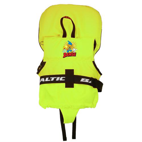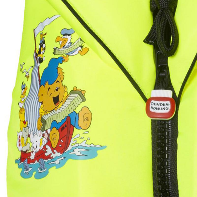 Ta med Bamse ut på sjön! Bamse och hans vänner är tryckta på fram- och baksidan. UV-gul gör den väldigt lätt att se. Dubbla fästen för grenband beroende på barnets längd. Visselpipa, reflexer och lyfthandtag i nacken.