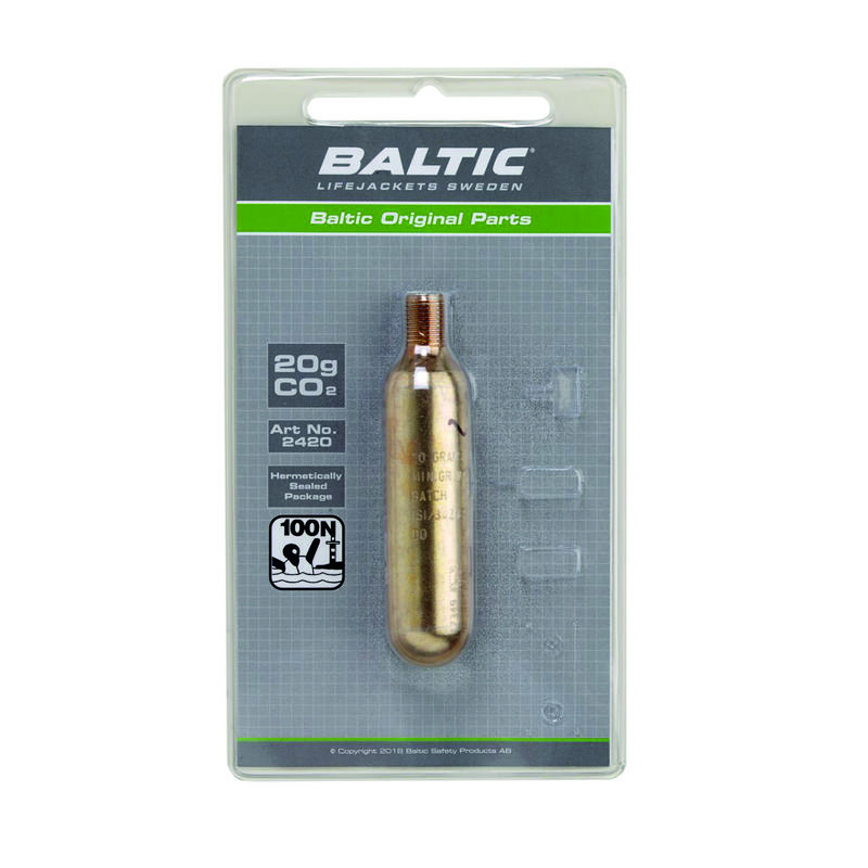 Gaspatron 20 gram för bl.a 100N västar. T.ex. Baltic Compact 100N, Baltic Active 100N. Gaspatron levereras i täta förpackningar. Stift ingår ej, det behövs inte.