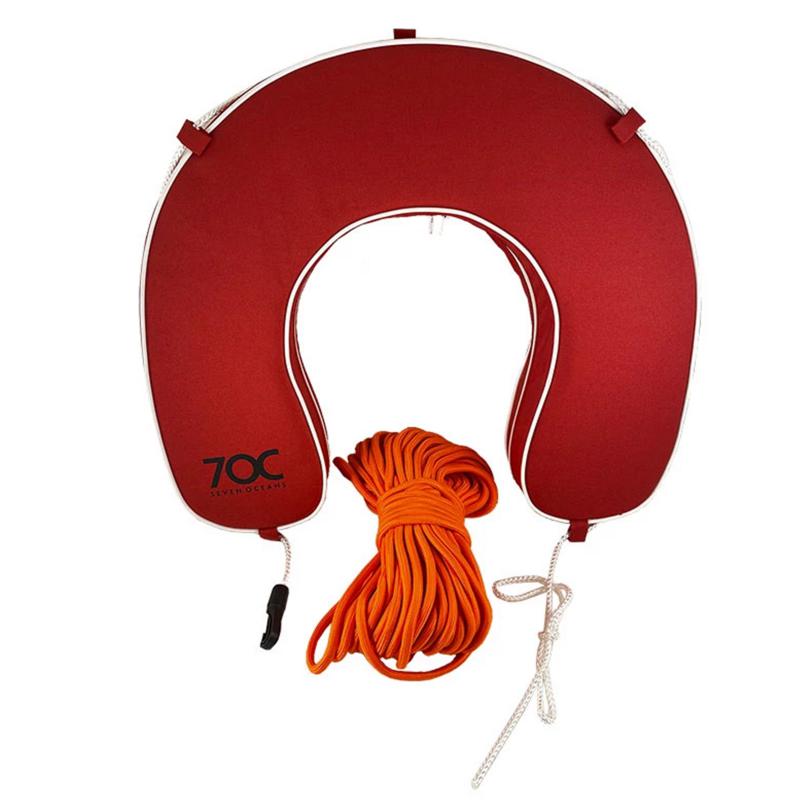 Livbojskit i rött från 7 Ocean. Innehåller hästskoboj och 30m orange flytlina. Enkel att montera med justerbara spännband på baksidan