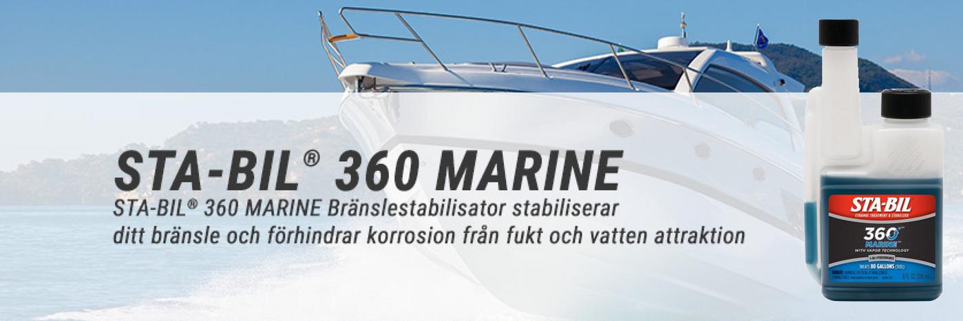 STA-BIL 360 Marine har utformats specifikt för att användas i en hård, fuktig miljö för marina motorer, som båtar, vattenskoter och till och med snöslungor. Den innehåller en högre koncentration av korrosionsskydd och rostskydd och rengöringsmedel för effektiv användning i dessa miljöer. Dessutom är den fortfarande användbar i all 2- och 4-taktsbensinmotorer; den är säkert att använda i alla motorer som kräver etanolblandad gas. Om du använder båten dagligen eller nästan dagligen, rekommenderas 30 ml STA-BIL 360 Marine per 40 liter bensin.