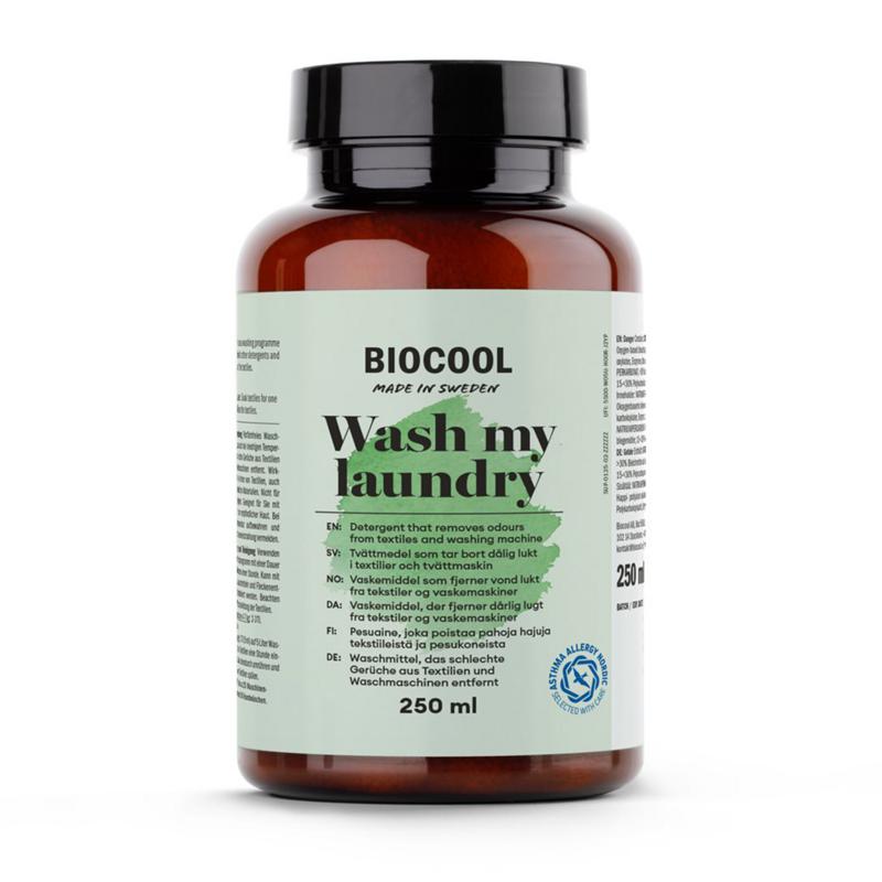 Biocool Wash my laundry är ett tvättmedel som tar bort dålig lukt redan vid 30 grader.