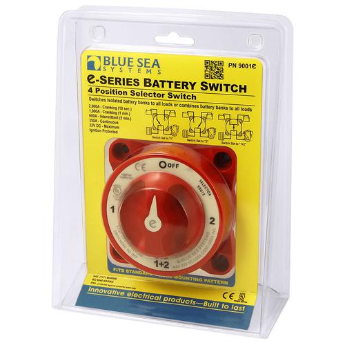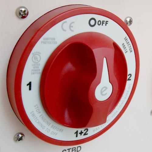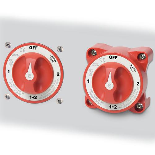 För 1-2 batterier och 6-12-24-32-48V system. Försedd med svepkontakter. Kan slås om under gång. Gastät = lämplig för motorrum. Förtennade 10 mm poler. För utanpåliggande eller infällt montage.
