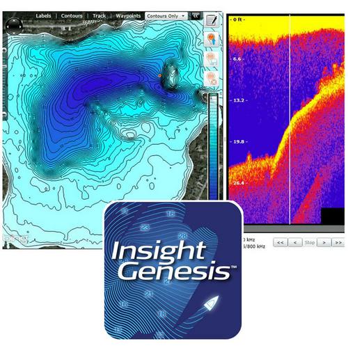 Insight Genesis-Planner Retail Card. Insight Genesis låter dig skapa kartor baserade på ekolodsloggar som du laddar upp, för att skapa detaljrika kartor som visar viktiga fiskhållningsområden och kartlägger okända områden på vattnet. Dela dina ekolodsinspelningar med andra eller håll dem privata endast för personligt bruk.