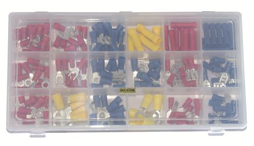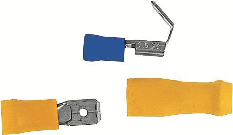 Innehåller förtennade ringkabelskor, gaffelkabelskor, flatstift samt skarvhylsor. Area 0,5-6,0 mm².