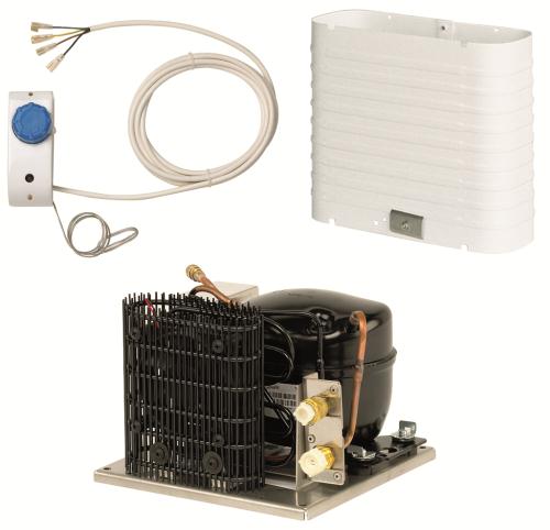 Komplett kylaggregat 130 liter. Med Danfoss BD35F-kompressor och O-evaparator med 2 meter flexirör kan monteras horisontellt eller vertikalt. Kompressorn kan placeras i lämpligt utrymme upp till 2 meter från boxen. Levereras komplett med steglös termostat och 3 meter kabel.