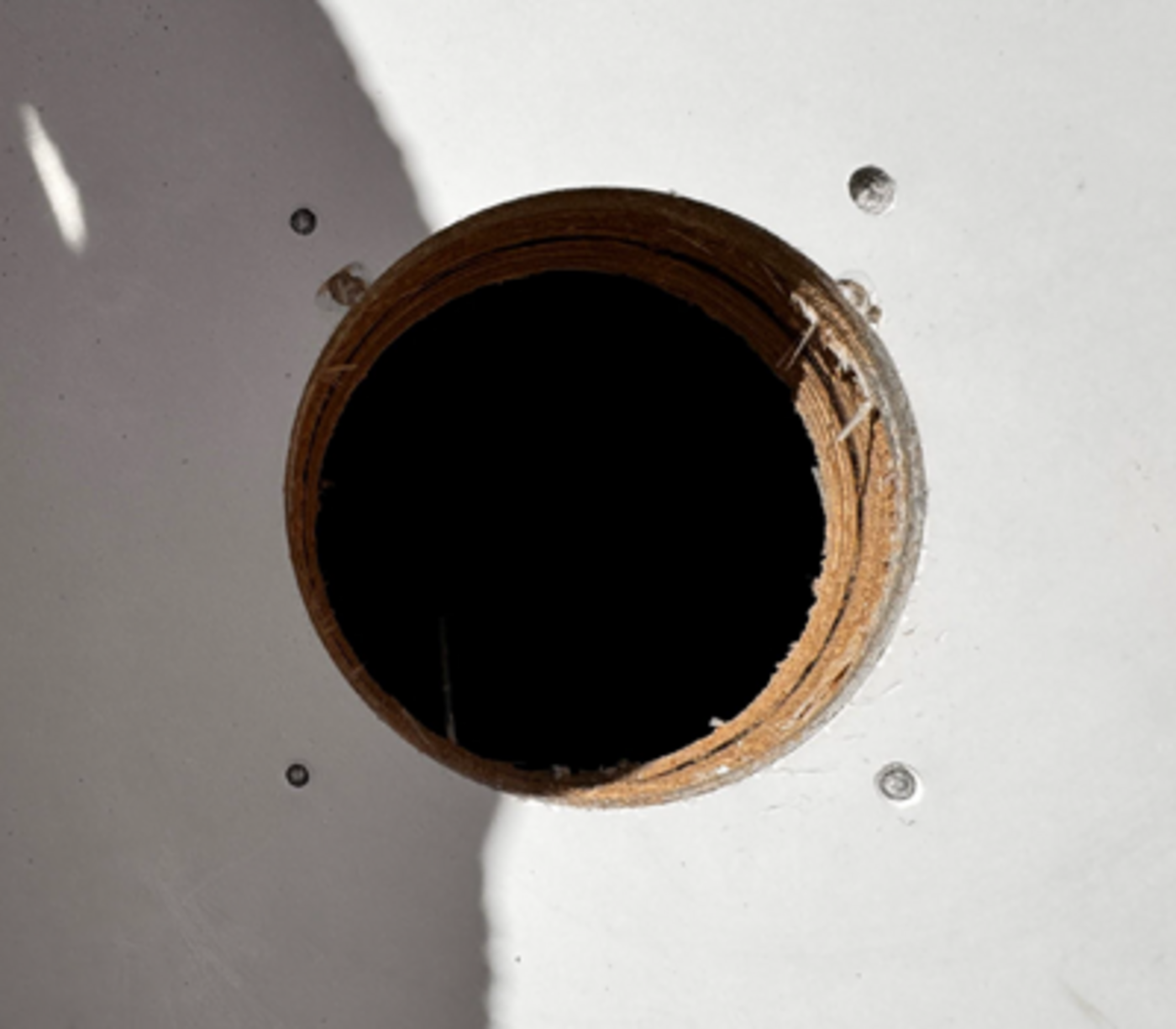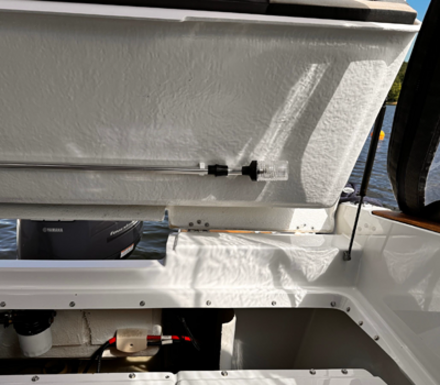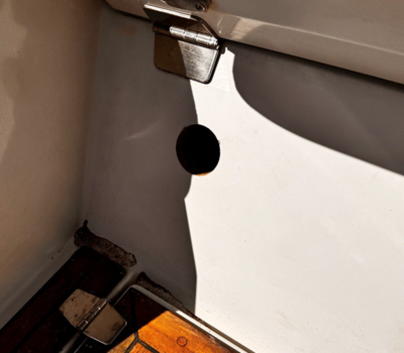 Då ett hål behövs borras genom skrovet så passade utrymmet bra då där redan finns en förstärkt skiva placerad som är färdig monterad på insidan av skrovet sedan köpet av båten.