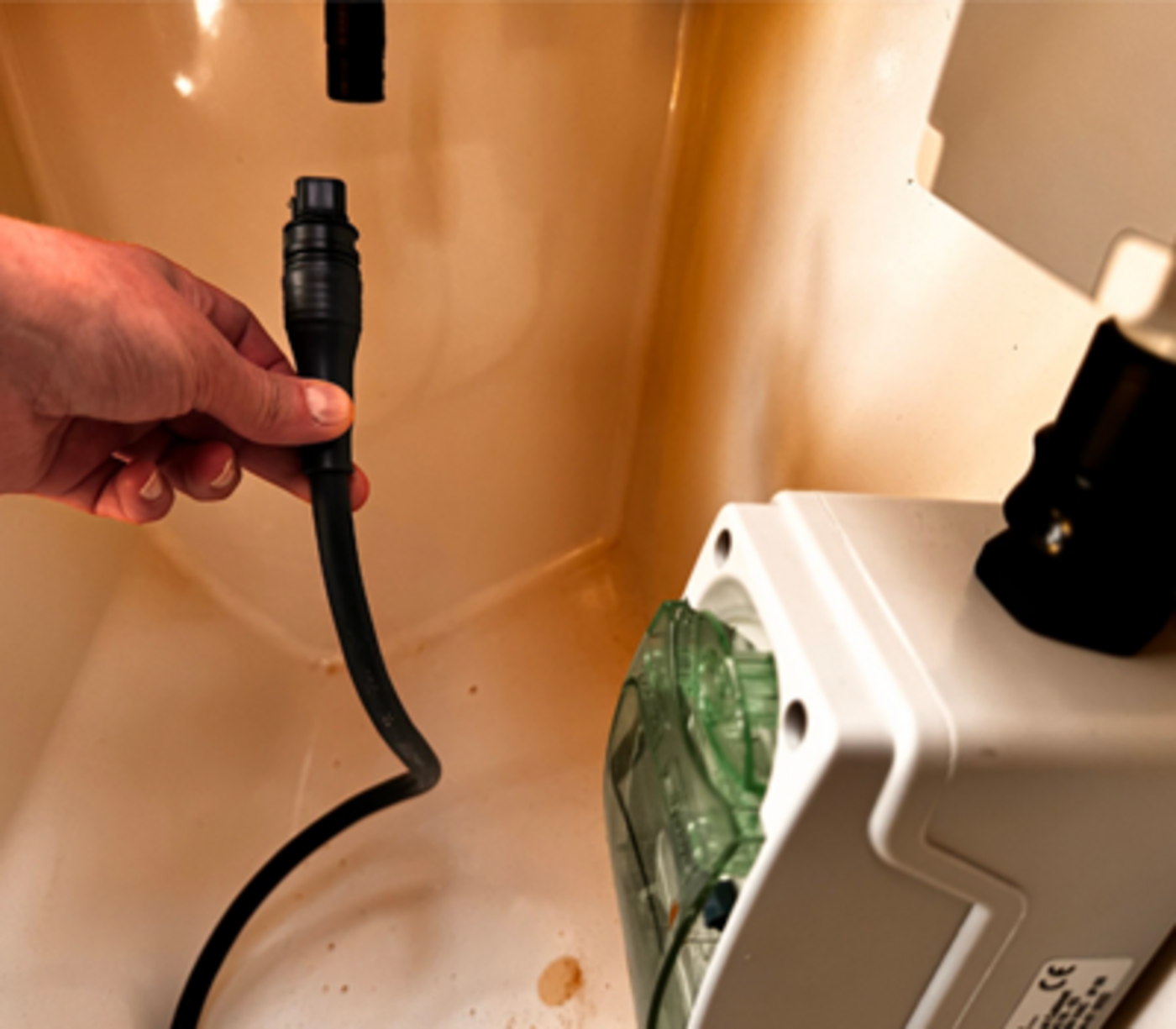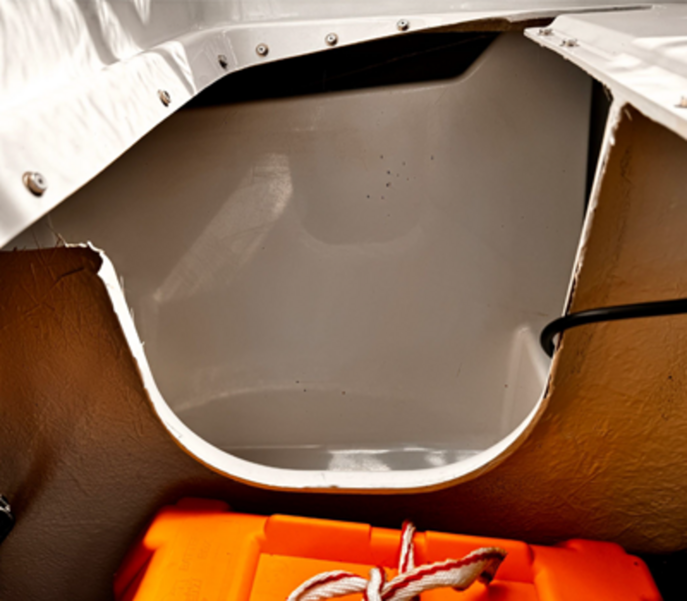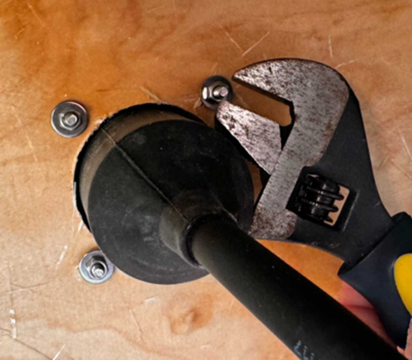 Då ett hål behövs borras genom skrovet så passade utrymmet bra då där redan finns en förstärkt skiva placerad som är färdig monterad på insidan av skrovet sedan köpet av båten.
