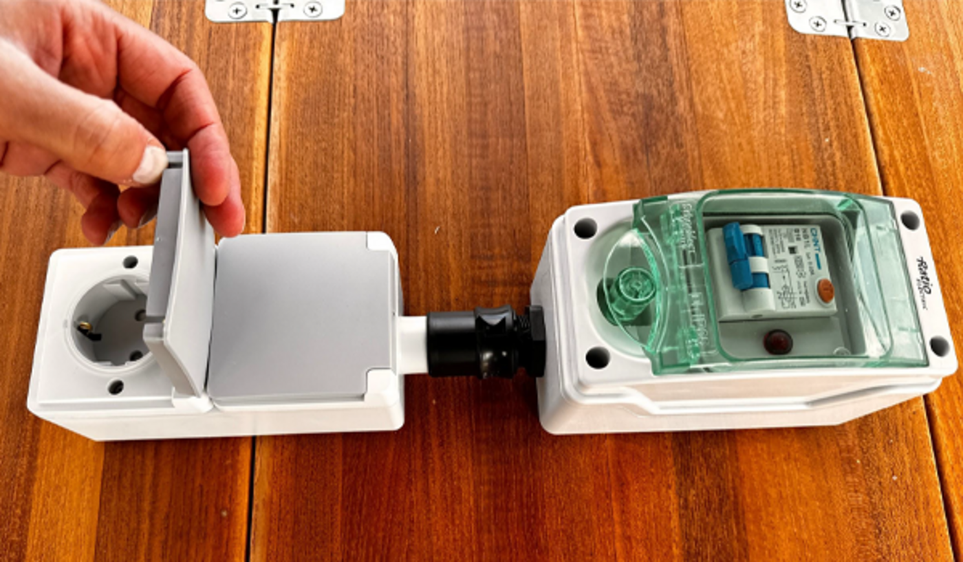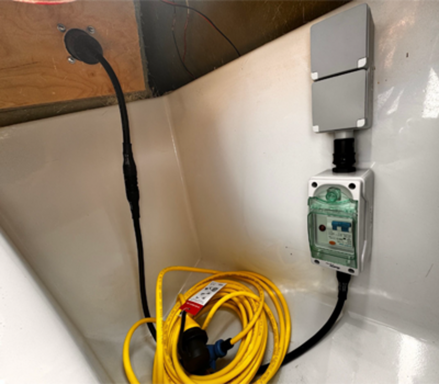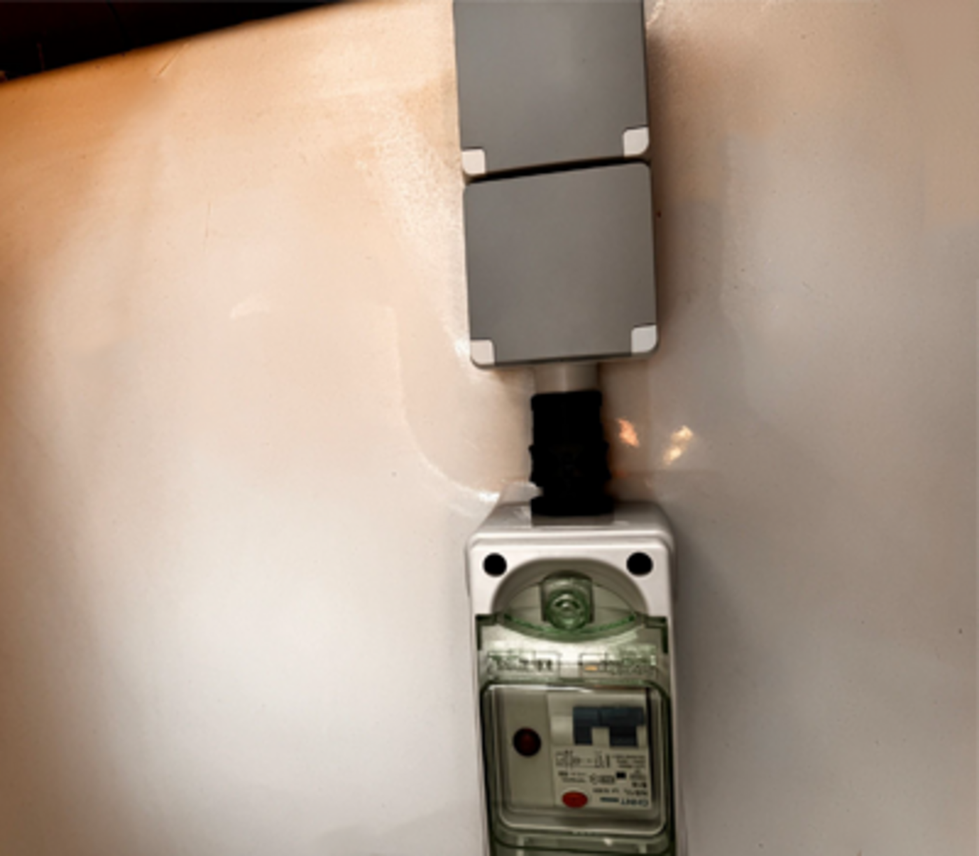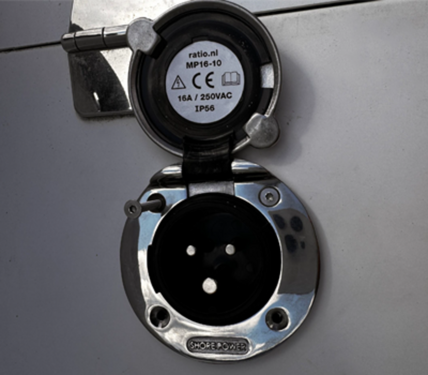 Här syns landströmscentral samt dubbelt eluttag. Landströmscentralen är på 16 ampere och den är försedd med jordfelsbrytare. Alla delar kunde sättas ihop via klick kontakter vilket jag tycker förenklar då inte en massa extra verktyg behövs.