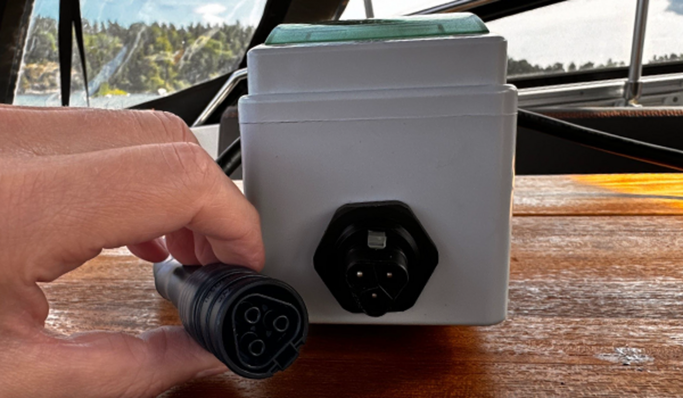 Fäste sedan upp landströmscentral med tillhörande dubbelt eluttag. Därefter kunde förlängningskabeln klickas ihop med kabeln tillhörande det rostfria elintaget. Den sista bilden visar allt sammankopplat och på plats i båten. Här syns även den gula 15 meter långa landströms kabeln som följde med i det paket jag valde att installera i båten.