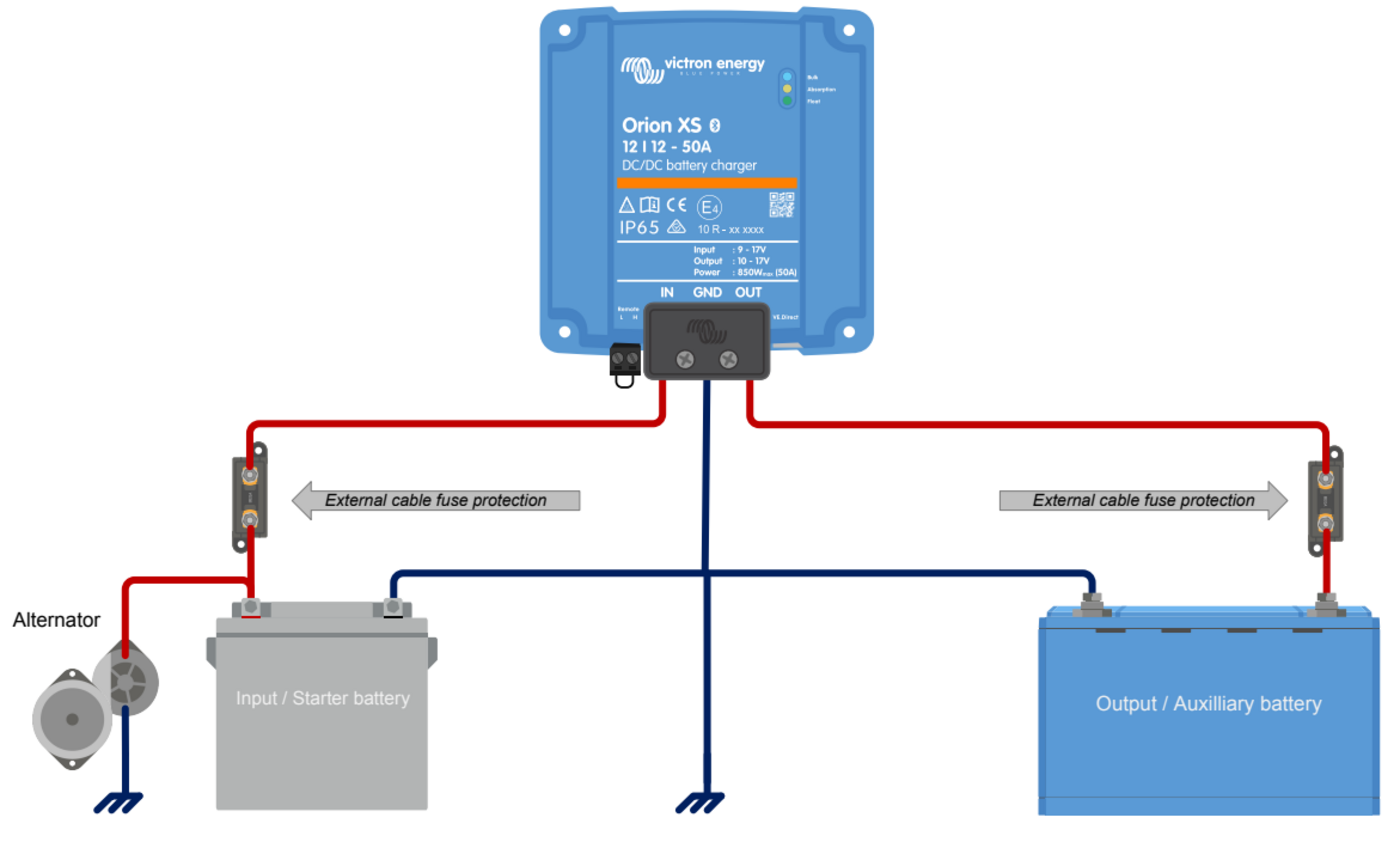 Såhär kopplar du in DCDC-laddaren: Generatorn bör kopplas direkt till startbatteriet som lämpligen är ett trögt bly-syra batteri. Mellan startbatteriet och litiumbatterierna ska din DCDC-laddare sitta. En oisolerad DCDC separerar plus-kabeln mellan bankerna och en isolerad separerar även minus-kabeln, för de flesta duger en oisolerad DCDC gott och väl. DCDC-laddaren ersätter det traditionella skiljereläet och kan dessutom ofta anpassas med ställbar laddström, tröskelvärde för laddningsstart med mera - allt via bluetooth!