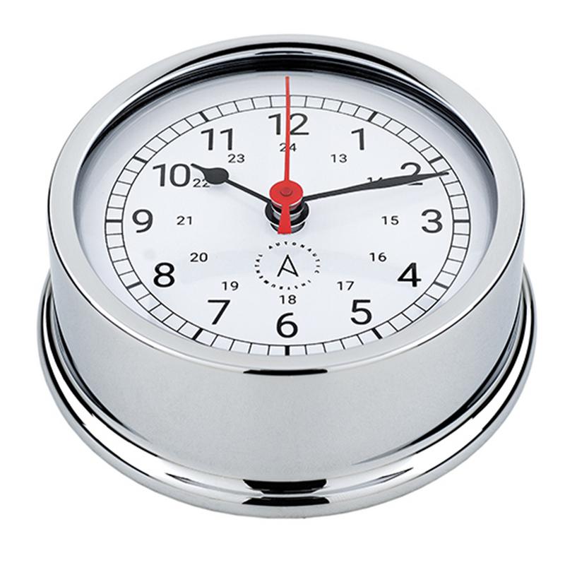 Klassiskt skeppsur med kromhus. Vit urtavla med svart text. Svarta tim- och minutvisare samt röd sekundvisare. Quartzurverk.