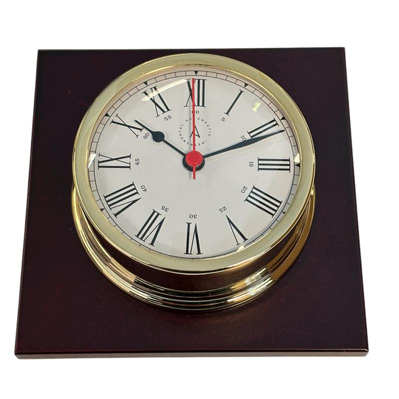 Klassiskt skeppsur med 18K-guldpläterad mässingshus, monterad på träplatta. Vit urtavla med svart text. Svarta tim- och minutvisare samt röd sekundvisare. Quartzurverk. Mässingshus med 18K-guldplätering innebär att skeppsuret inte blir missfärgad och får fläckar i marin miljö. Helt underhållsfri.