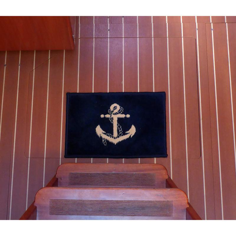 Marinblå matta med broderat ankare eller kompassros. Gummerad undersida så att mattan ej halkar runt.