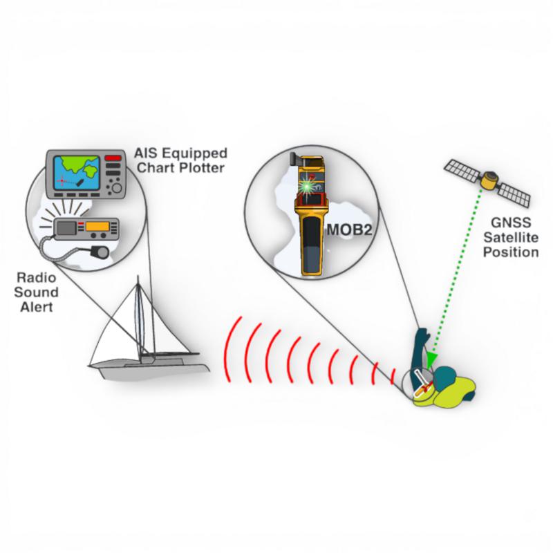 Vid aktivering sänder MOB2 ut sin första nödsignal inom 15 sekunder. Med hjälp av GNSS (GPS och Galileo) skickas din exakta position, ner till några meters noggrannhet, till det egna fartyget och andra AIS-utrustade fartyg i närheten – upp till cirka 5 nautiska mil, beroende på förhållanden.