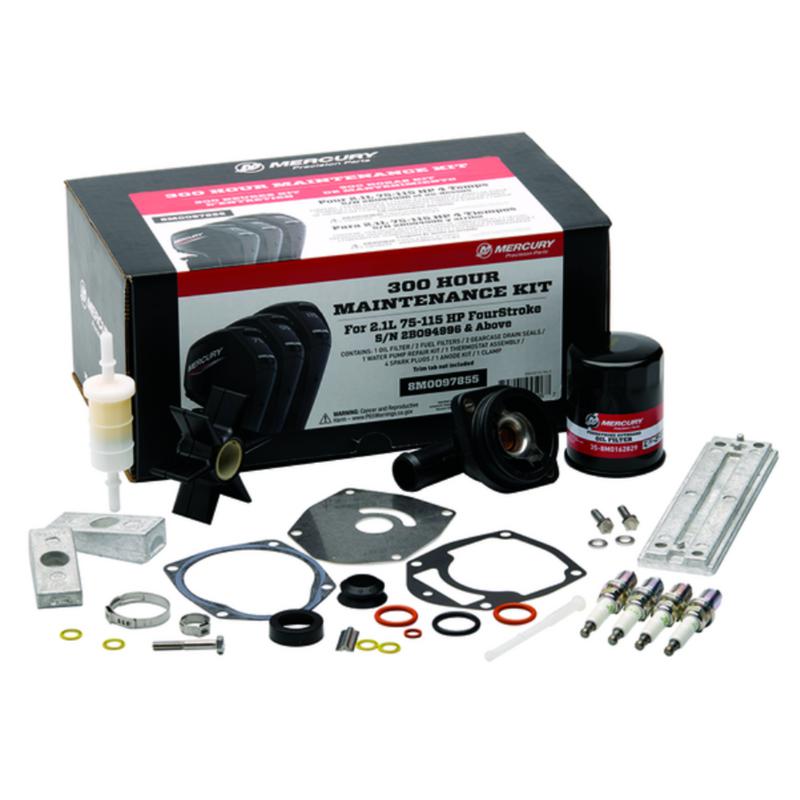 Servicekit 300 timmar för nyare Mercury 75, 80, 90, 100 och 115 EFI motorer med 2,1 liters motorblock (se serienummer). Denna servicesats innehåller det du behöver för den större 300 timmars servicen inklusive impellerbyte, komplettera endast med olja.