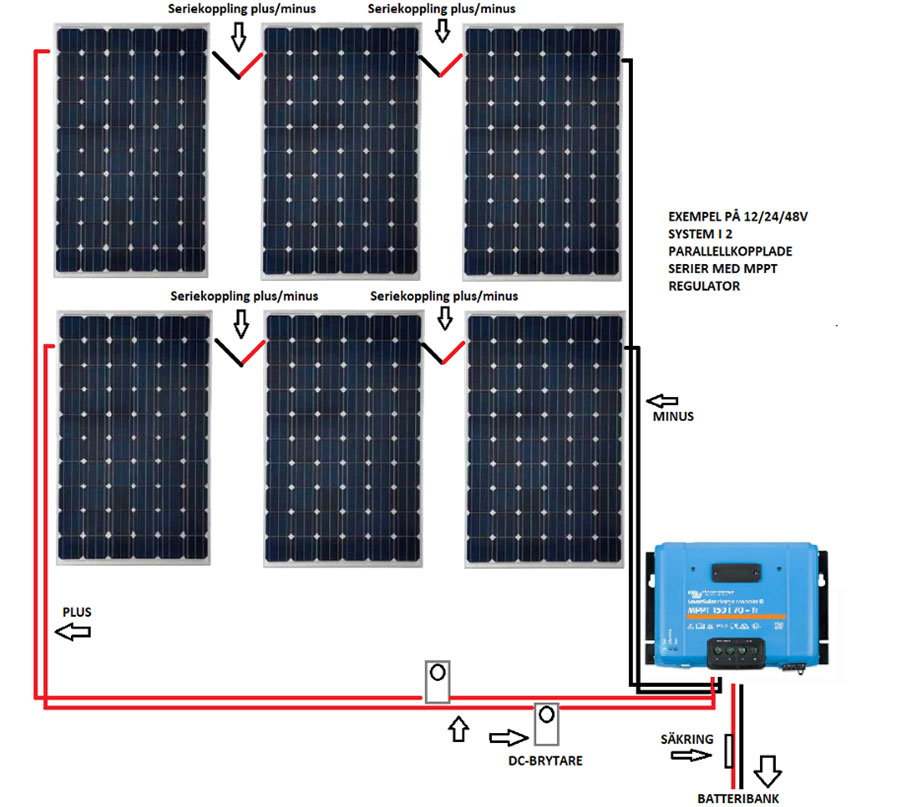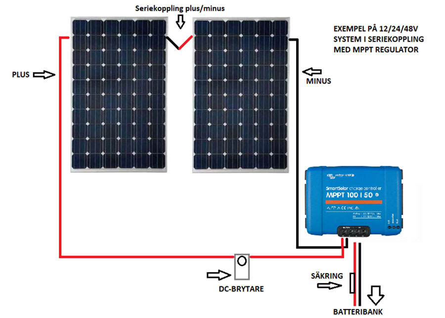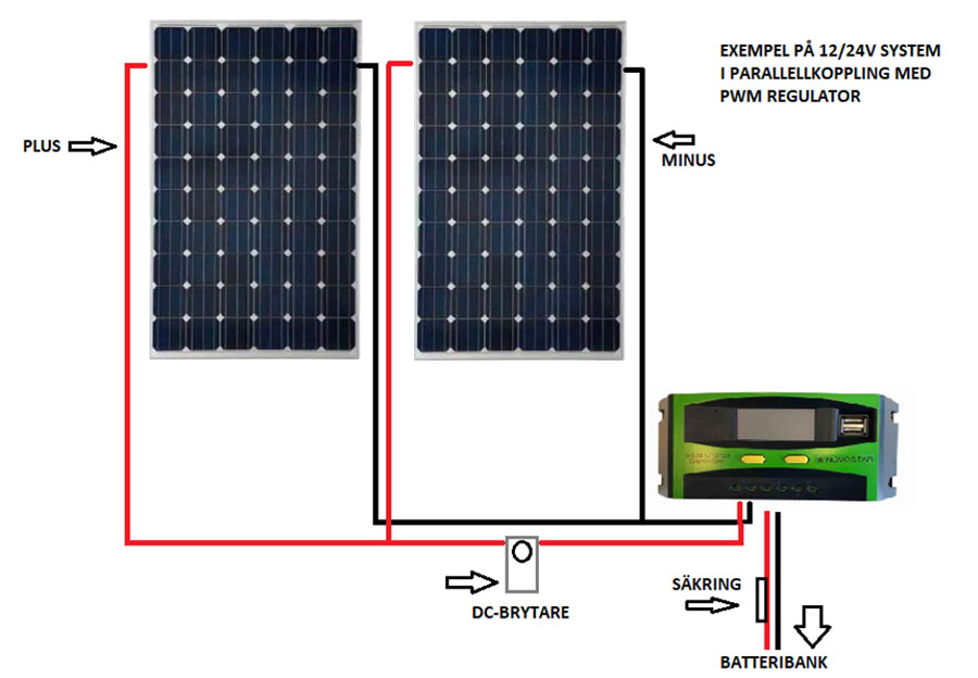 Notera att man även kan seriekoppla 2st 12V solpaneler till ett 24V system med 24V batteribank och i detta fall använda regulator av antingen PWM eller MPPT-typ.