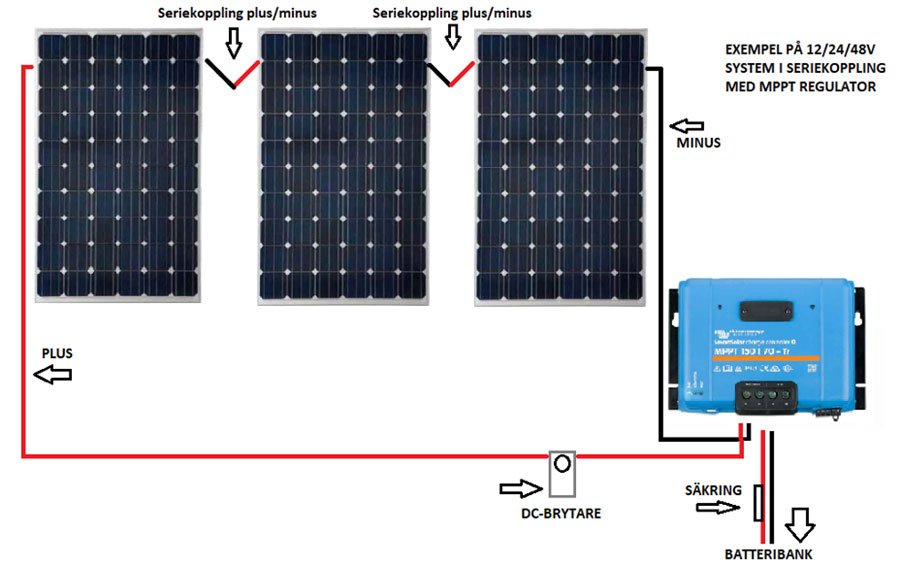 Exempel: Till en MPPT med en maxinspänning på 100V bör ej anslutas mer än 4st 12V solpaneler i serie, eller mer än 2st 24V solpaneler i serie. För modeller på 150V är maximum 5-6st 12V solpaneler eller 3st 24V solpaneler i serie. Maxgränser på MPPT avseende volt är vanligen 70/100/150/250V.