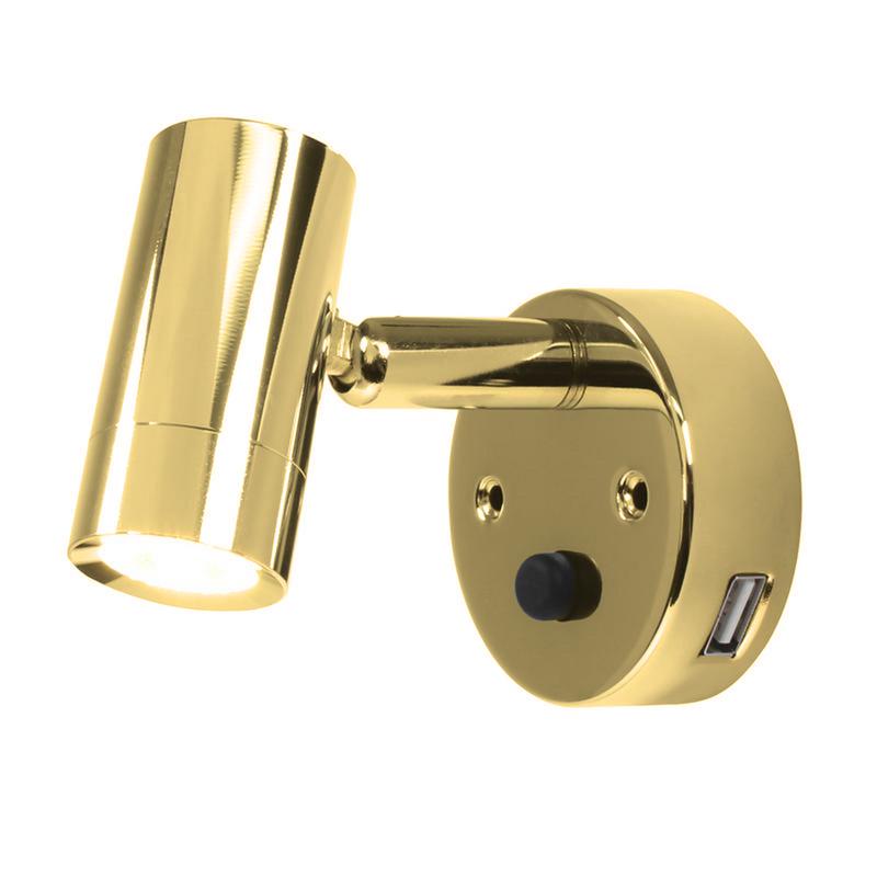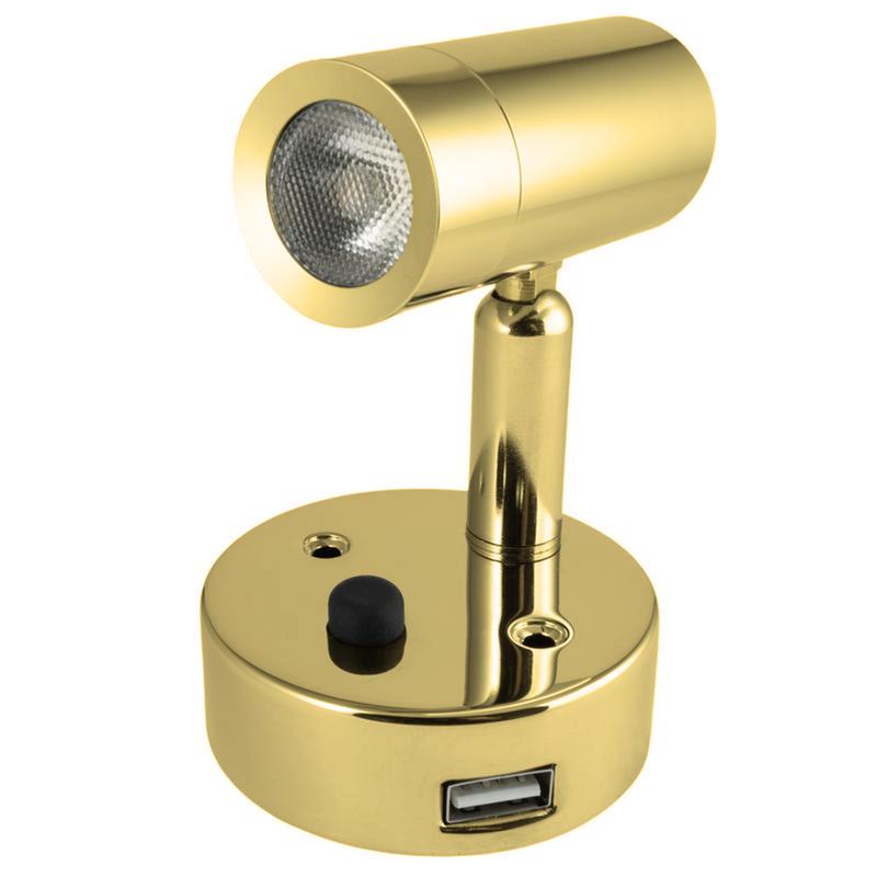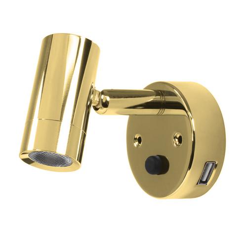 Skott/läslampa 1W (LED) från Nautilight i mässing. Ger ett behagligt varmt ljus för en mysigare stämning ombord. Inbyggt 2A USB-uttag vid lampfoten. Strömbrytare med på/av funktion.