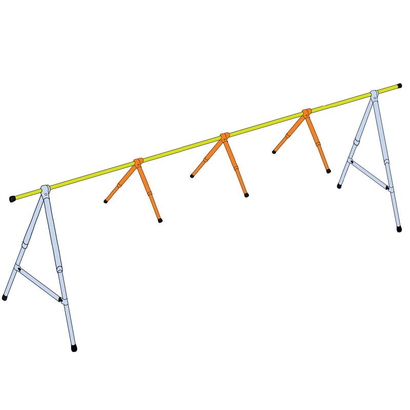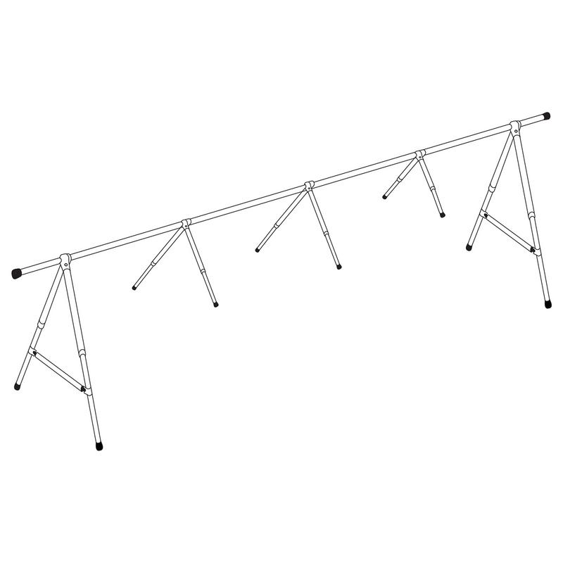 Monteringen påbörjas med att placera det bakre A-benparet tillsammans med ett överliggarrör. Därefter byggs ställningen vidare sektion för sektion, med jämnt avstånd mellan benen. Om ett överliggarrör sticker ut för långt kan det enkelt kapas eller tas bort. För att säkerställa en smidig montering rekommenderas att du kontrollerar alla delar innan du börjar, då mindre rör kan vara inskjutna i större förpackningen. Ett tips är att märka upp alla delar med tejp eller penna första gången du monterar för att underlätta framtida hantering.