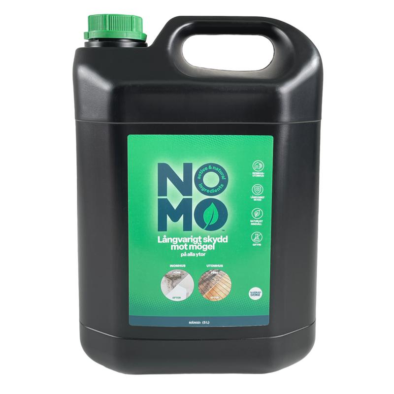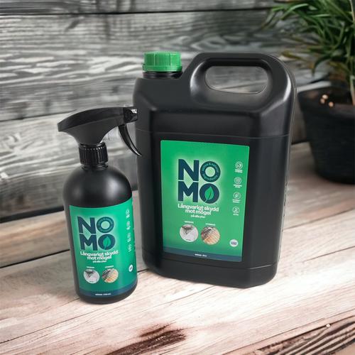 NOMO består av helt naturliga och biologiskt nedbrytbara ingredienser och är mycket effektiv mot mögel. Medlet sprayas på och får verka i upp till 5-10 minuter, arbeta sedan med t.ex. borste, svamp, tygtrasa eller högtryckstvätt för en djuprengöring av ytan. Vänta i ytterligare 2-3 minuter och spola sedan av. Låt torka helt och avsluta alltid med att lägga på ett tunt lager (inte rinna) NOMO, för att skapa ett långsiktigt skydd mot mögel för framtiden.