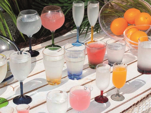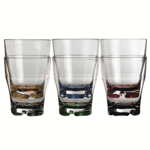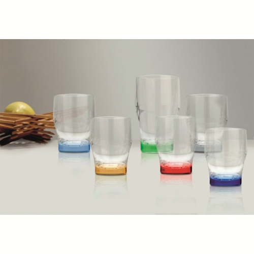 Set om 6 glas med färgad botten. Färgerna: mörkblå, ljusblå, röd, gul, grön och klar. Stapelbara. Tillverkade i polykarbonat. 33cl. För kalla drycker. Tål maskindisk i övrekorgen på låg temperatur. Mått Ø 8,8cm, Höjd 11cm.