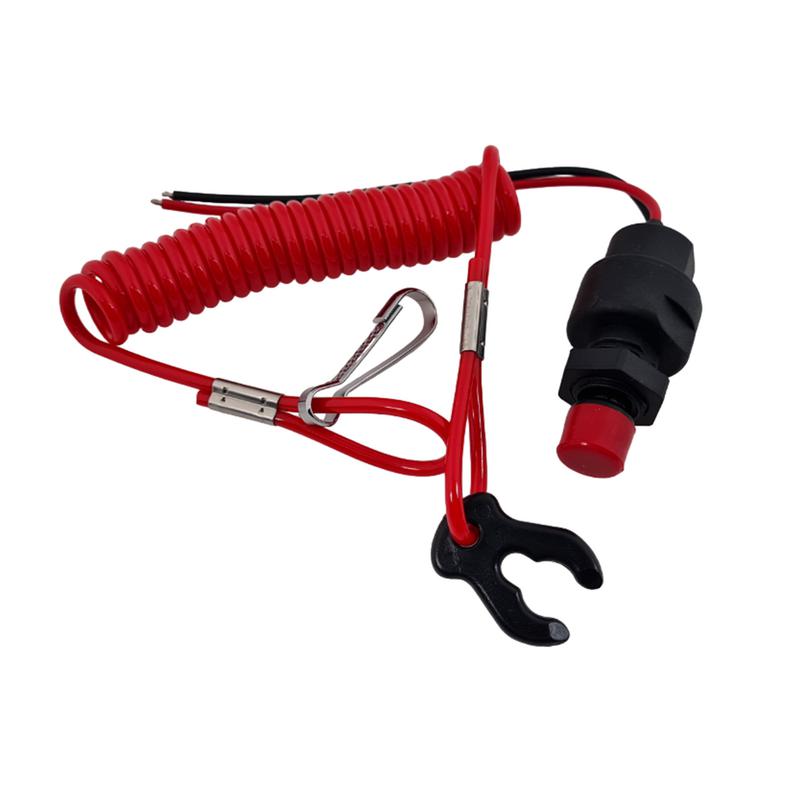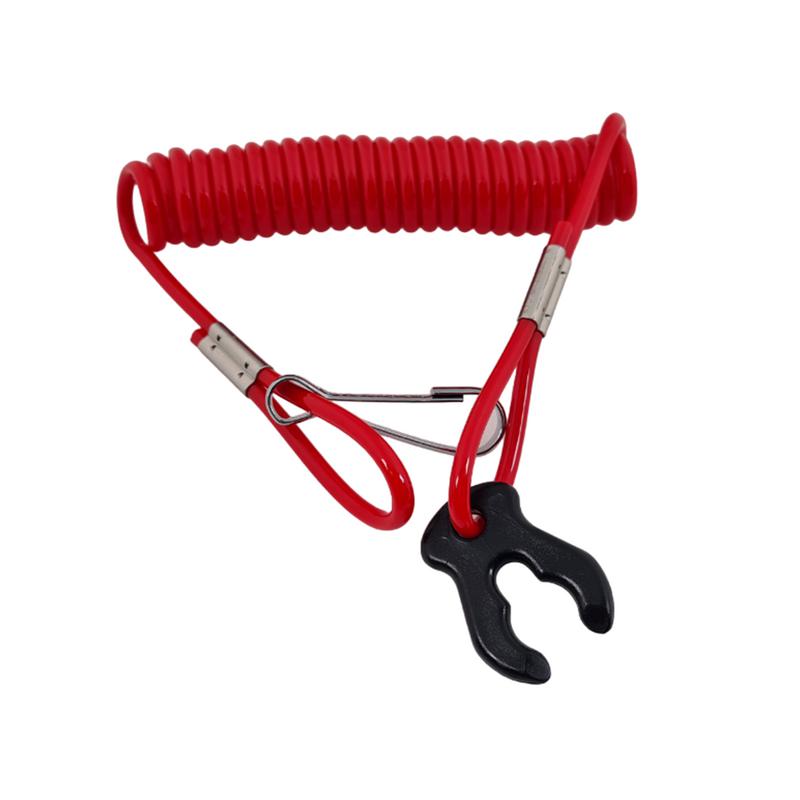 Förkromad mässing. Plastklädd. Stannar motorn om föraren faller i båten eller överbord.