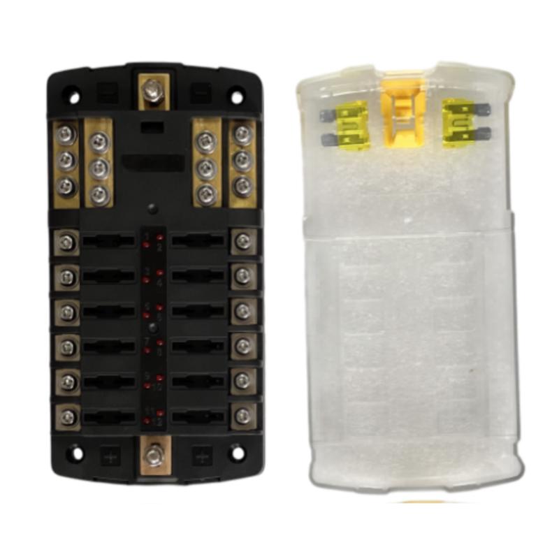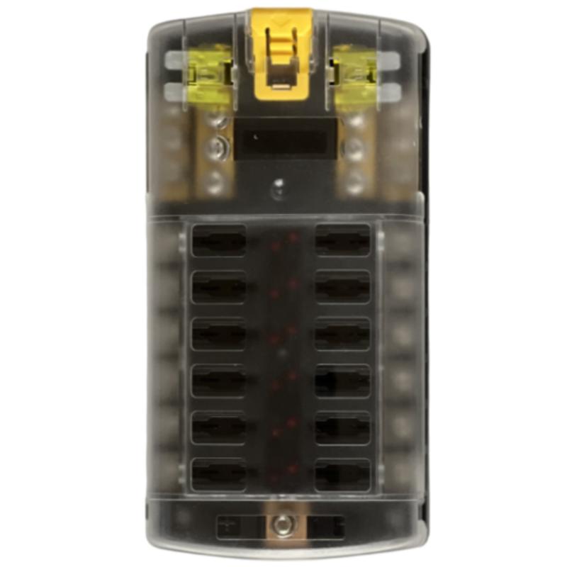 Säkringsbox från ProSupply för 12 stycken flatstiftssäkringar. Utrustad med LED-indikatorer för bruten säkring.