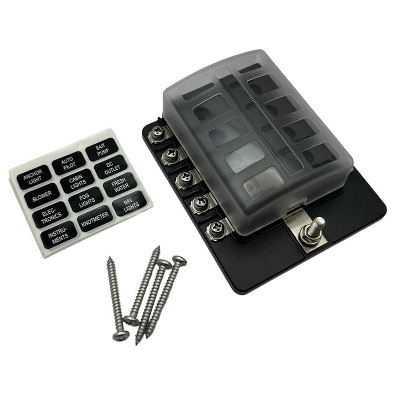 Säkringsbox med en ingående plus (+) och plats 10st flatstiftsäkringar med max 25A/utgång.