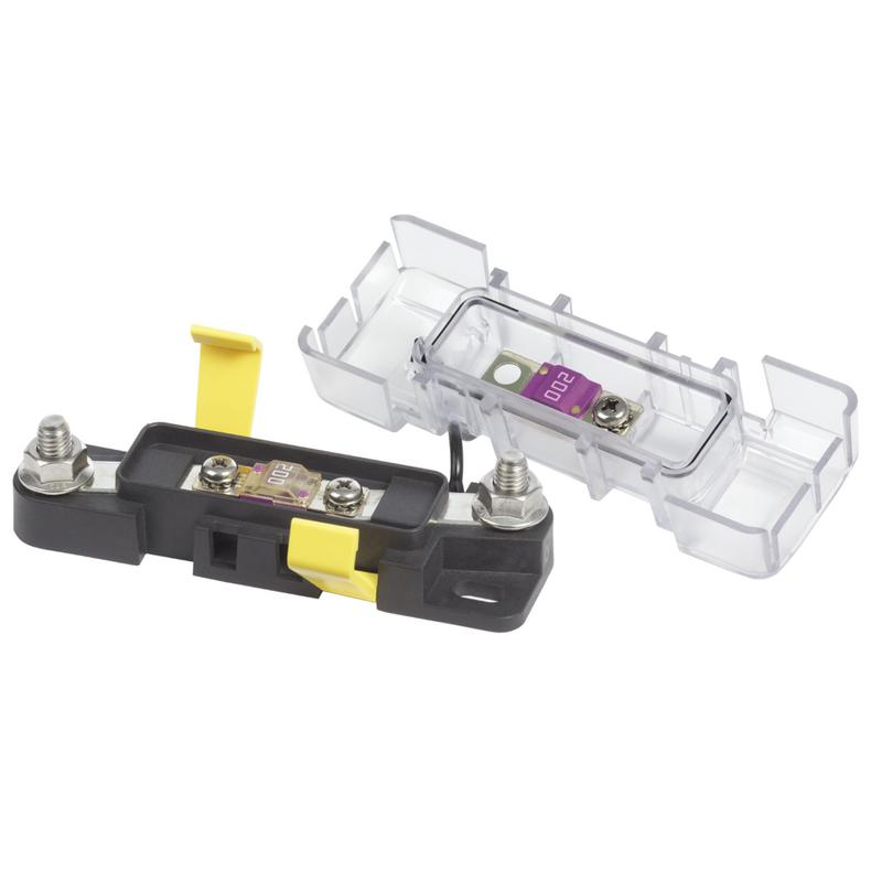 Säkringshållare med gastät skyddskåpa för huvudsäkring monterad på t.ex. huvudströmbrytare, bogpropeller eller ankarspel. Förtennad. Minskar risken för kabelbrand. 30 - 200A