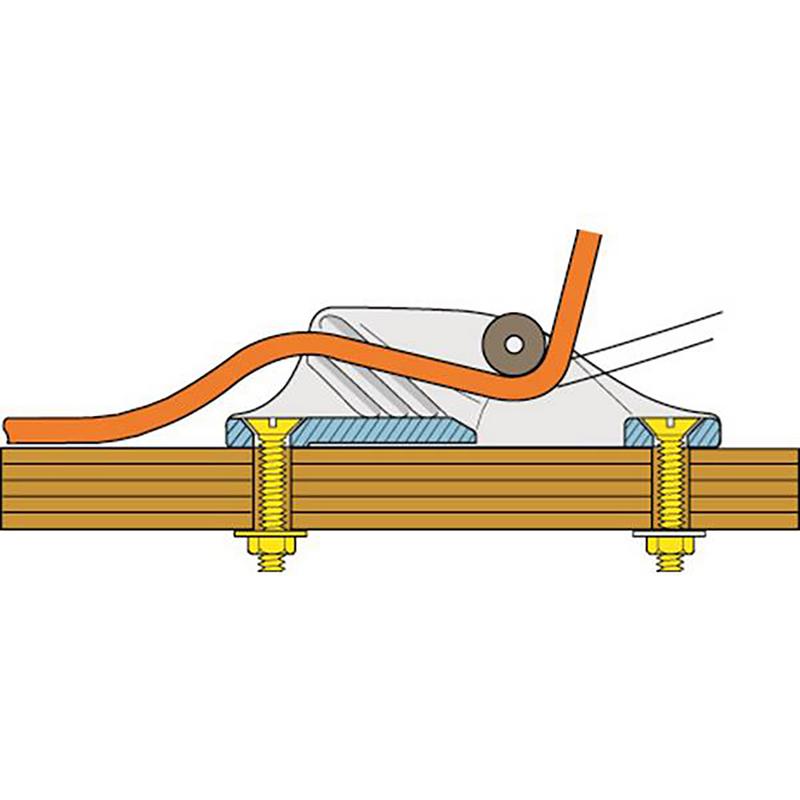 Cleat med bryttrissa för lina som kommer uppifrån. Tillverkad i aluminium.
