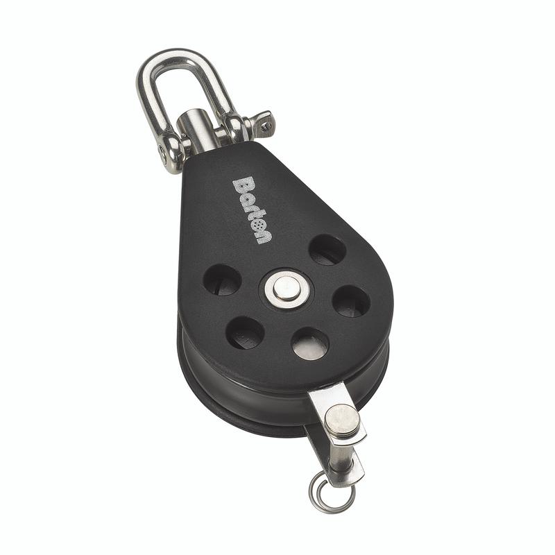 Enkelblock med svivel och hundsvott. Blockskiva i Acetalplast med glidlager. Alla lastbärande delar i rostfritt syrafast stål.
