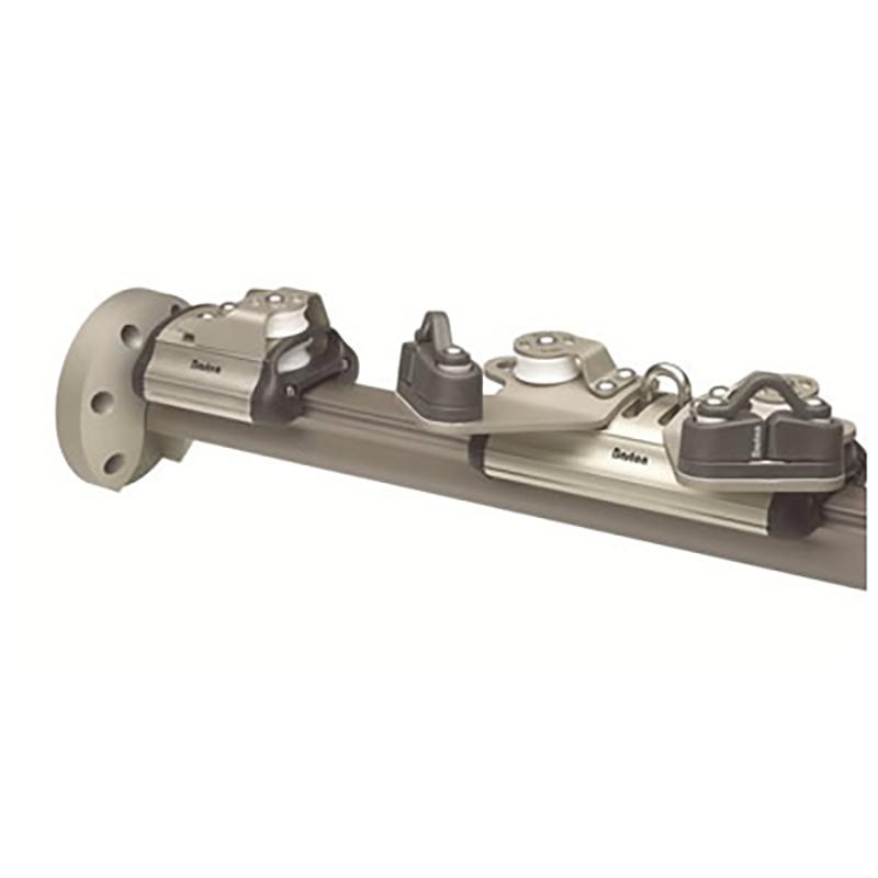 Storskotssystem med löstagbar skena. Plocka bort hela skenan när den inte används för maximalt utrymme i sittbrunnen. Inga verktyg för att plocka bort skena, det är fjäderbelastade kulor som trycks in för att lösgöra skenan.