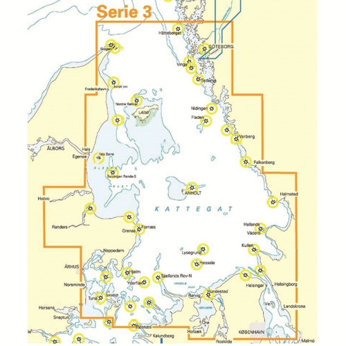 Tyska Båtsportkortet Atlas serie 3 sträcker sig mellan Samsö - Sund - Kattegatt.