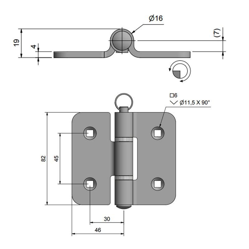 Kraftigt gångjärn med svetsad knorra och demonterbar sprint. Monteras med försänkt skruv eller vagnsbult.