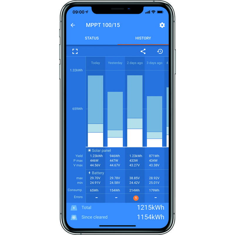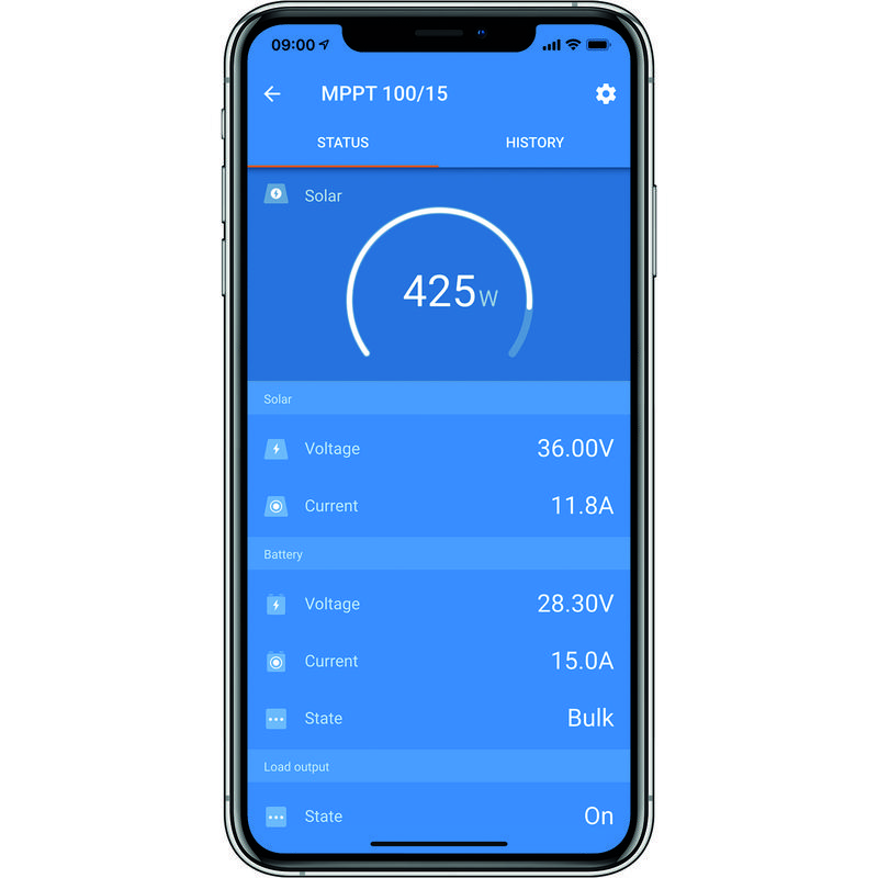 Du övervakar enkelt via VictronConnect-appen på Android eller iOS. Appen visar laddningsström, spänning och historik i realtid.