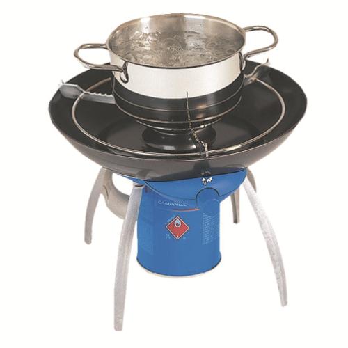Kombinerad gasolgrill och kokplatta med piezotändning. Teflonbehandlat galler och kärl. Kärlet kan fyllas på med vatten vilket gör att dropp från grillningen samlas upp och gör renhållningen enkel. Avtagbara ben och grillhäll gör den lätt att packa och stuva undan. Grillyta Ø33 cm. 1350 Watt. Koktid: 1lit vatten ca 6 min. Grillen används med Campingaz gasolflaskor.