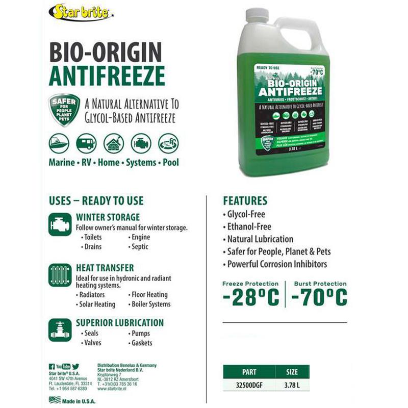 Frostskyddsmedel är färdigbland (Ready-To-Use) och inget tillsatt vatten behövs. Star Brite BIO-Origin Antifreeze har ett frysskydd ner till -28ºC och sprängskydd -70ºC så du kan vara säker på att ditt vattensystem hålls i optimalt skick även under de kallaste vintrarna.