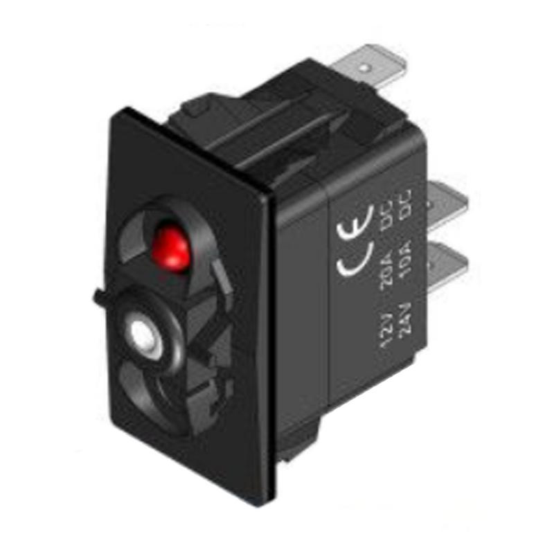 Strömställare med inbyggd röd LED-indikering för tydlig statusvisning. Den robusta designen ger säker och stabil manövrering även i tuffa miljöer. Flatstiftsanslutning gör installationen enkel och snabb i både nya och befintliga paneler. Brytaren passar perfekt för belysning, pumpar, fläktar och annan 12–24 V-utrustning. Symbolknappen säljs separat och snäpps fast för ett enkel montage.