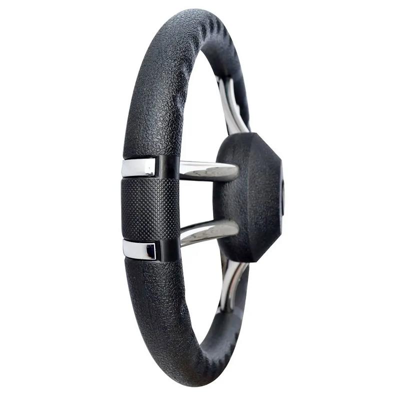 Ratt från Italienska Savoretti Armando, tillverkad i rostfritt syrafast stål med rattring i svart polyuretan för extra bra grepp. Ratten är 35cm i diameter med 6st, 16mm böjda ekrar i rostfritt stål. Rattnav i PU-belagd aluminium och Navkapsel/täckkåpa i läderimitation för en lyxigare känsla.