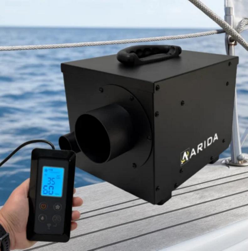 Arida Færder är kompakt, robust och byggd för lång livslängd. Den är enkel att placera dold bakom luckor eller i skåp, samtidigt som den externa kontrollpanelen och WiFi-funktionen gör det möjligt att övervaka och styra enheten på distans via mobiltelefon. Den fasta installationen och möjligheten till extern hygrostat gör den idealisk för kontinuerlig fuktkontroll ombord.